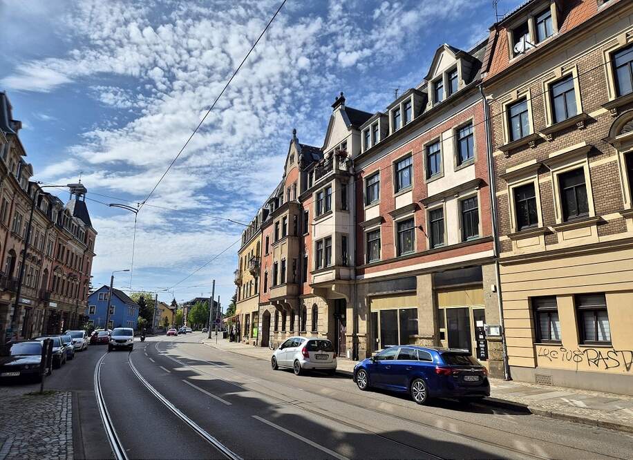 Die Immobilie befindet sich in Dresden Mickten, direkt an einer frequentierten Ein-und Ausfallstraße und nahe einem Haltepunkt des ÖPNV.