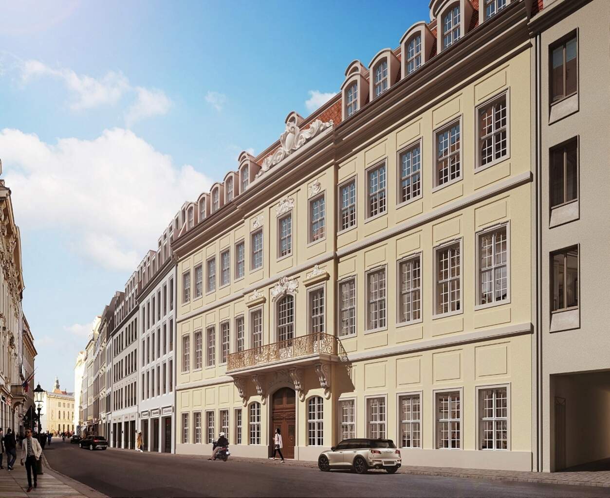 Neben der historischen Fassade vom Palais Hoym werden auch wesentliche architektonische Elemente wie der originale Brunnen und die Gewölbe im Inneren wiederhergestellt. So fügt sich das Gesamtensemble aus Rekonstruktion und Neubauten nahtlos in das berühmte Stadtbild ein.