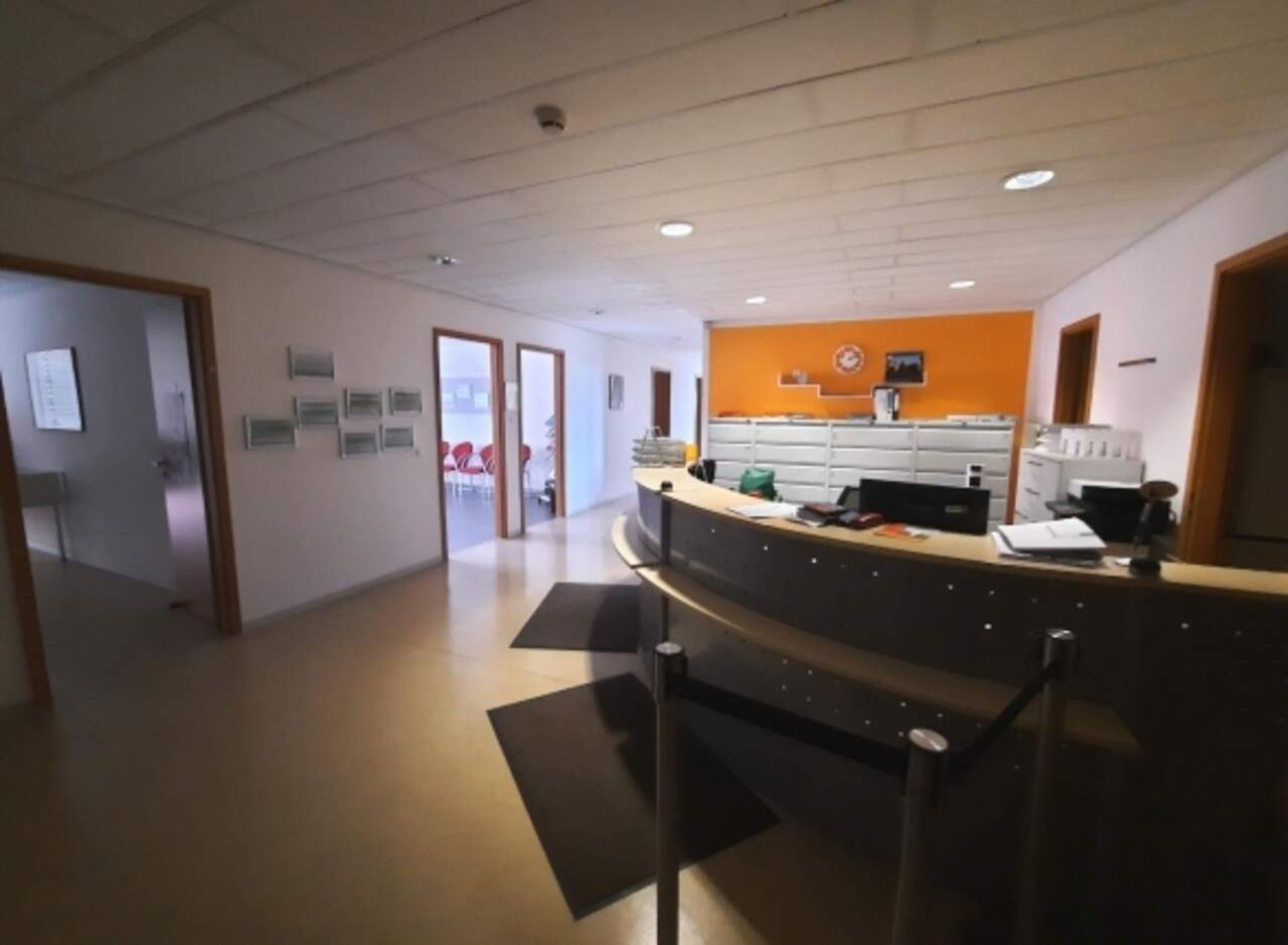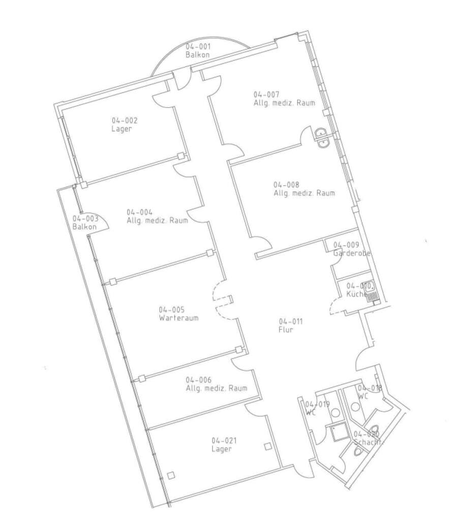 Die Mietfläche ist über einen Aufzug und Treppenhaus zugänglich und besteht aus u.a. einem Empfangsbereich, Vorbereitungszimmer, Behandlungsräumen, Teeküche, 2 WCs (Gäste, Personal mit Dusche) und weiteren Räumen.