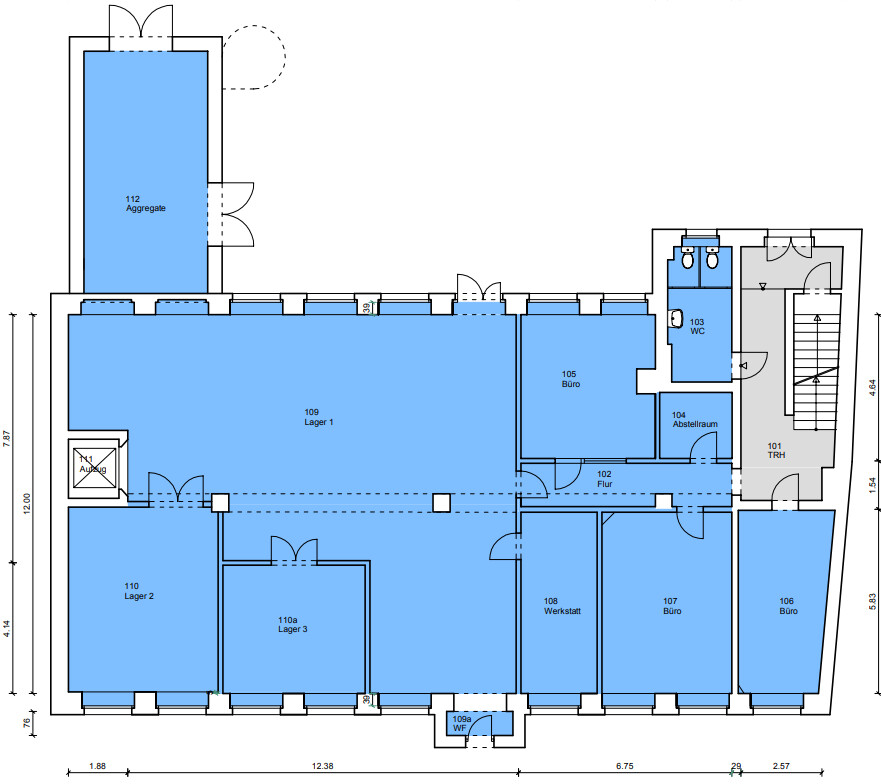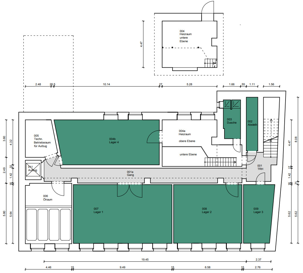 Zur Vermietung steht ein vielfältig nutzbares Büro- und Lagergebäude mit einer Gesamtmietfläche von ca. 845 m², die sich auf drei Ebenen verteilt (Kellergeschoss, Erdgeschoss und 1. Obergeschoss).
