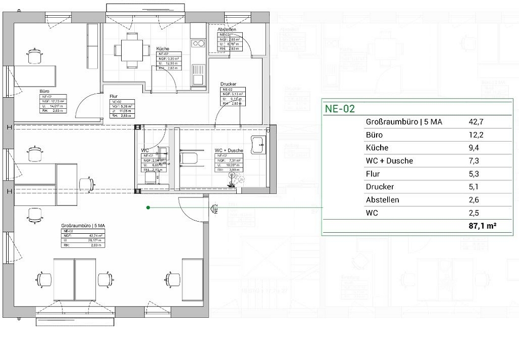 Zur Vermietung steht eine ca. 181 m² große, moderne Büroeinheit im 1. Obergeschoss eines attraktiven Büroneubaus. Die Fläche ist flexibel nutzbar und in zwei separate Bereiche unterteilt: Eine Anmietung ist bereits ab ca. 87 m² möglich. Besonders hervorzuheben ist, dass der linke Bereich barrierefrei sowie rollstuhlgeeignet ausgeführt ist und somit höchsten Ansprüchen an Komfort und Zugänglichkeit genügt.