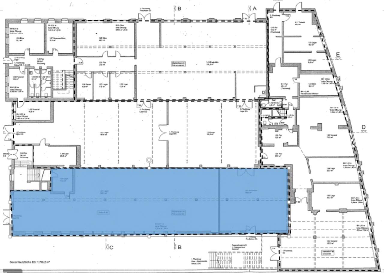 Über eine doppelflüglige Tür gelangt man in die Einheit. Weitere Lager- und Produktionsflächen als auch moderne Büros können zusätzlich angemietet werden.