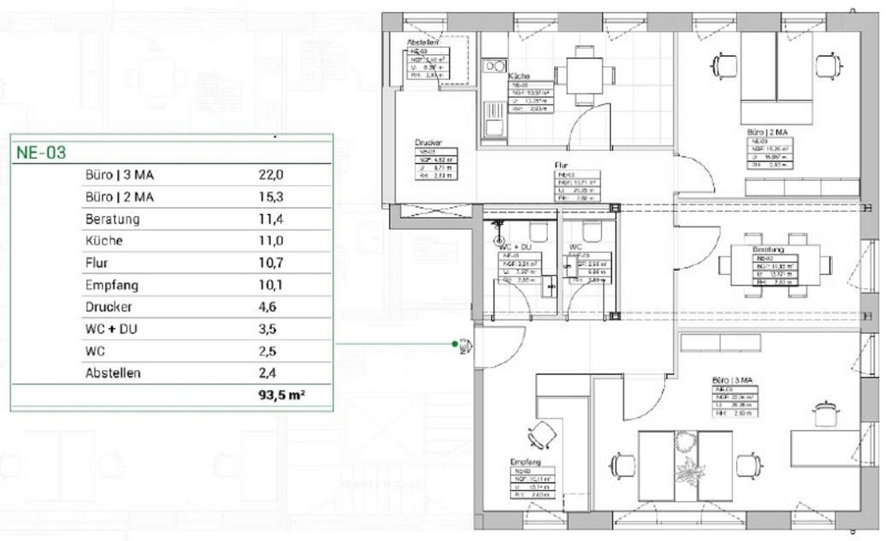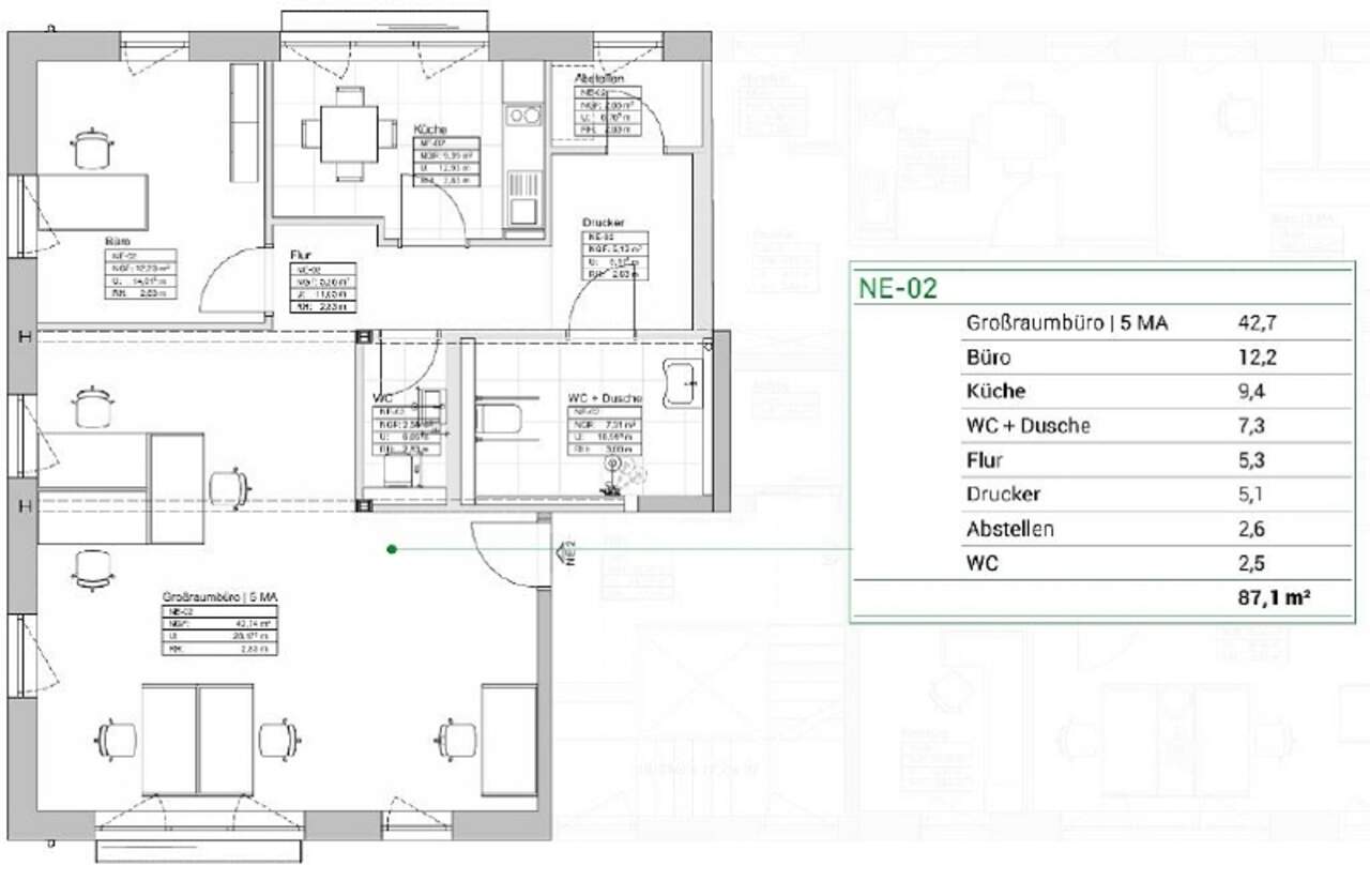 Zur Vermietung steht ein ca. 181 m² großes Büro, dass sich im 1. Obergeschoss eines Büroneubaus befindet. Die Fertigstellung ist für das 1. Quartal 2026 geplant. Die Mietfläche besteht aktuell aus 2 nebeneinander liegenden Teilflächen.
