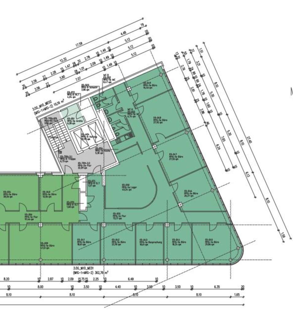 Zur Vermietung steht eine ca. 340 m² große Bürofläche, die sich im 3. Obergeschoss eines Geschäftshauses befindet. Die Gesamtmietfläche inkl. Nebenflächen beträgt ca. 364 m².