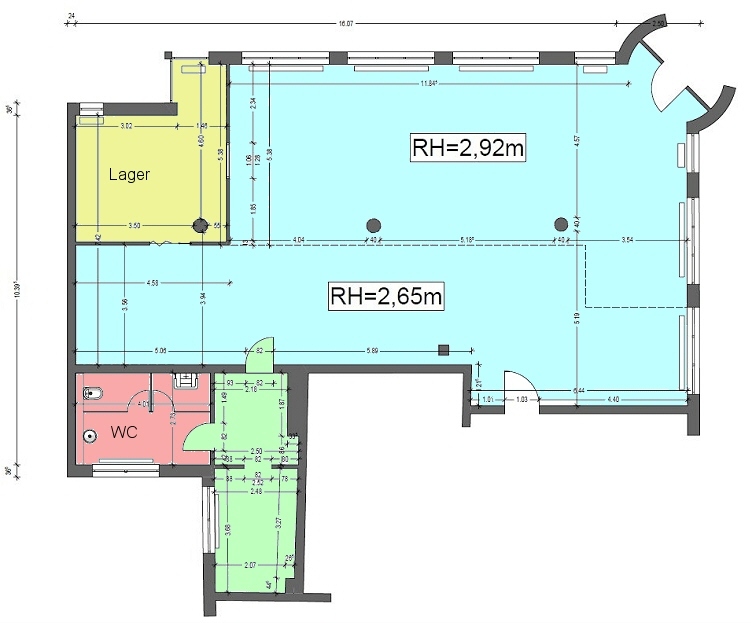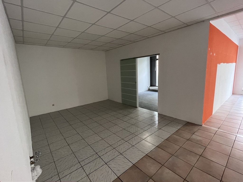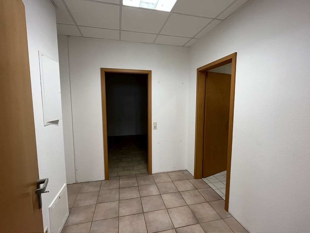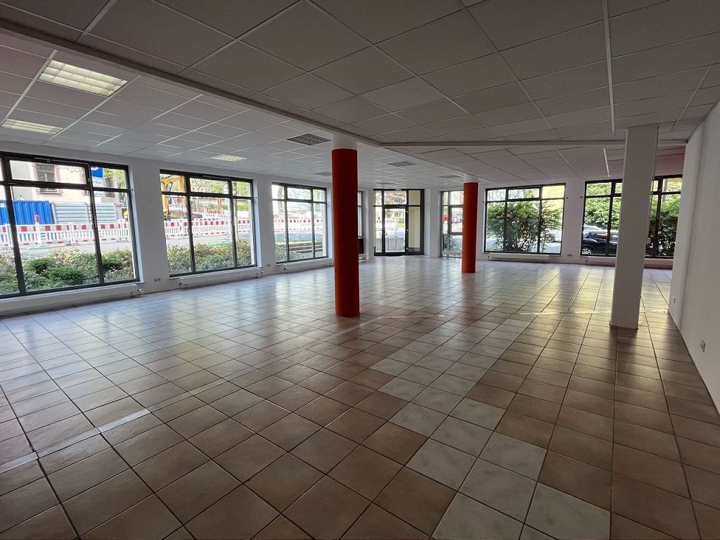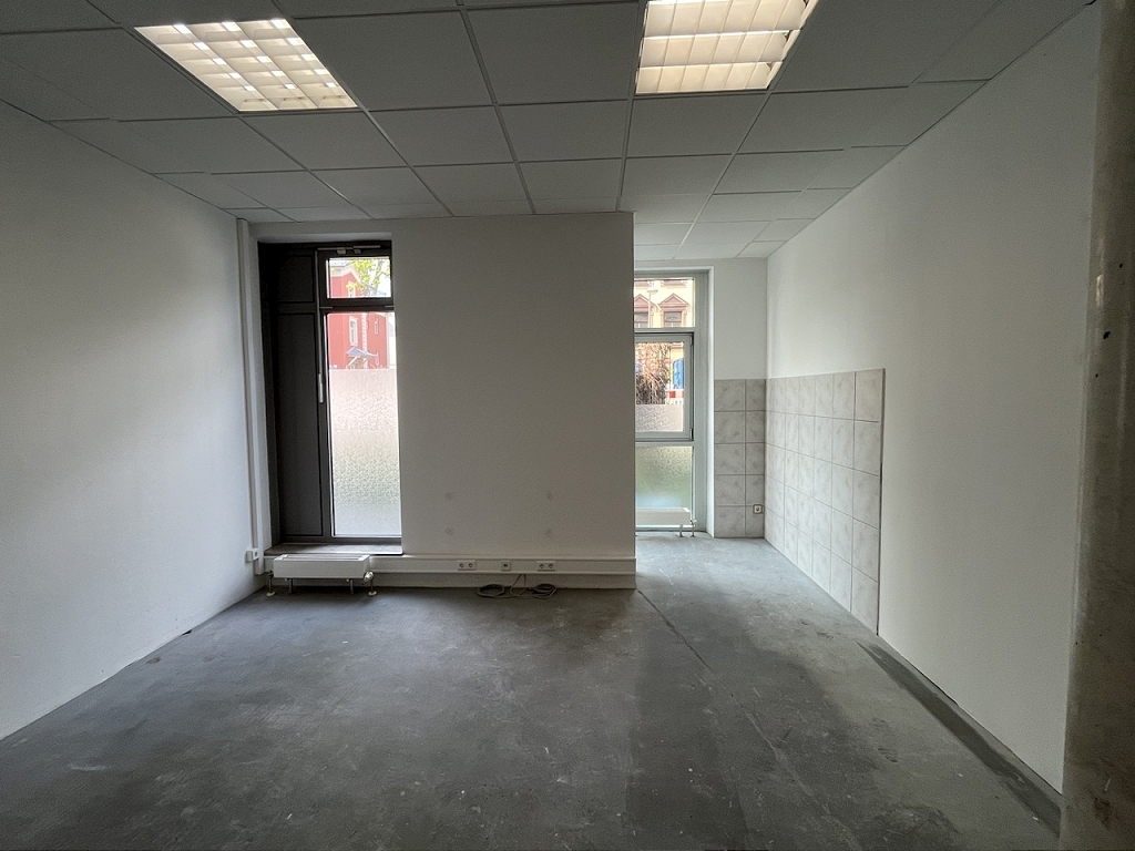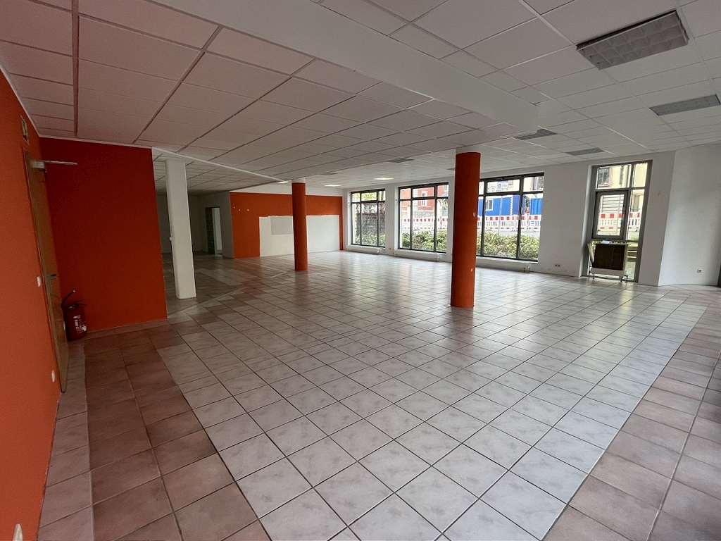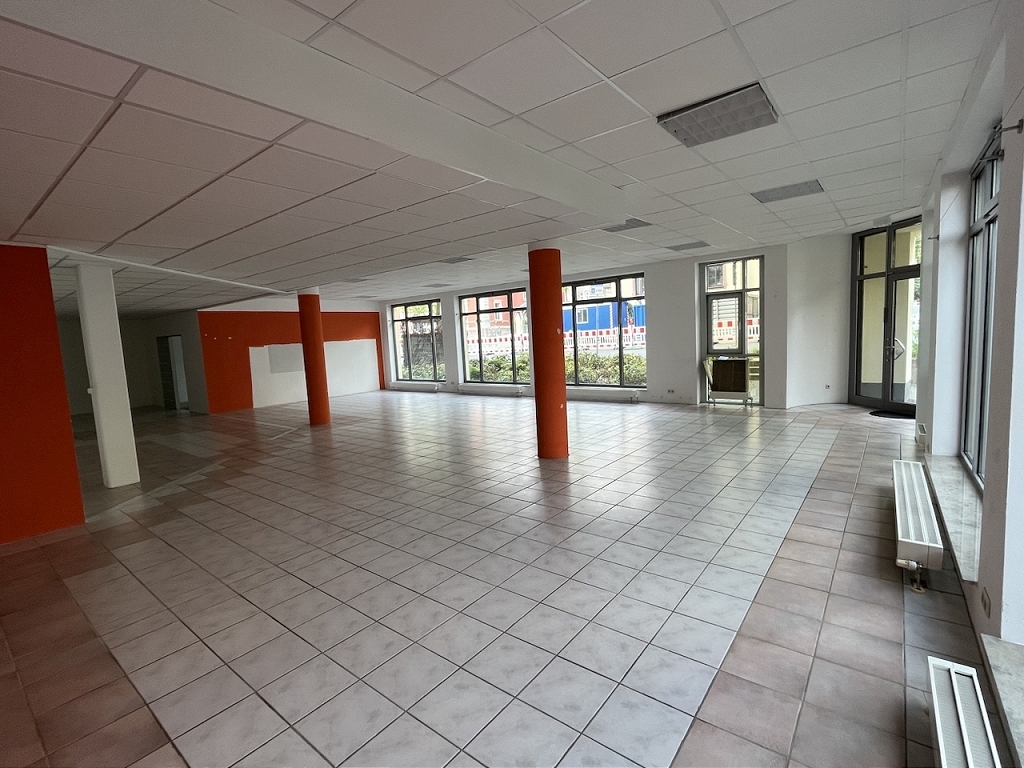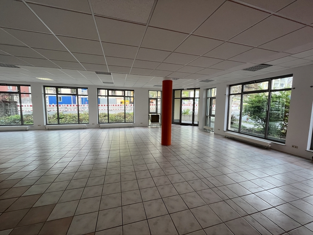 Die EG-Bürofläche wirkt durch die bodentiefen Schaufenster hell und freundlich. Besonderes Highlight sind die Säulen. Zu den Nebenflächen gehören eine kleine Bürofläche sowie sanitäre Anlagen und ein Lager. Geeignet ist die Fläche für einen Dienstleister oder als Callcenter -oder Schulungsfläche.