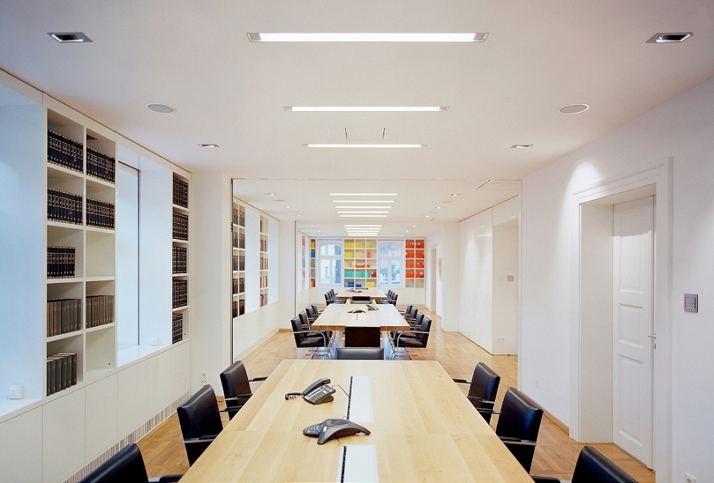 Im Rahmen der Sanierung wurde das Innere des Gebäudes komplett neu organisiert. So erschließt sich von einer zentralen Empfangszone, in vertikaler und horizontaler Transparenz, die Enfilade der Büros. Um diesen Kern sind in dezentraler Anordnung Gesprächszonen, Teeküchen, wie auch die Lese- und Bibliotheksbereiche in allen Etagen, als offene Strukturen in optischem oder akustischem Bezug angeordnet.