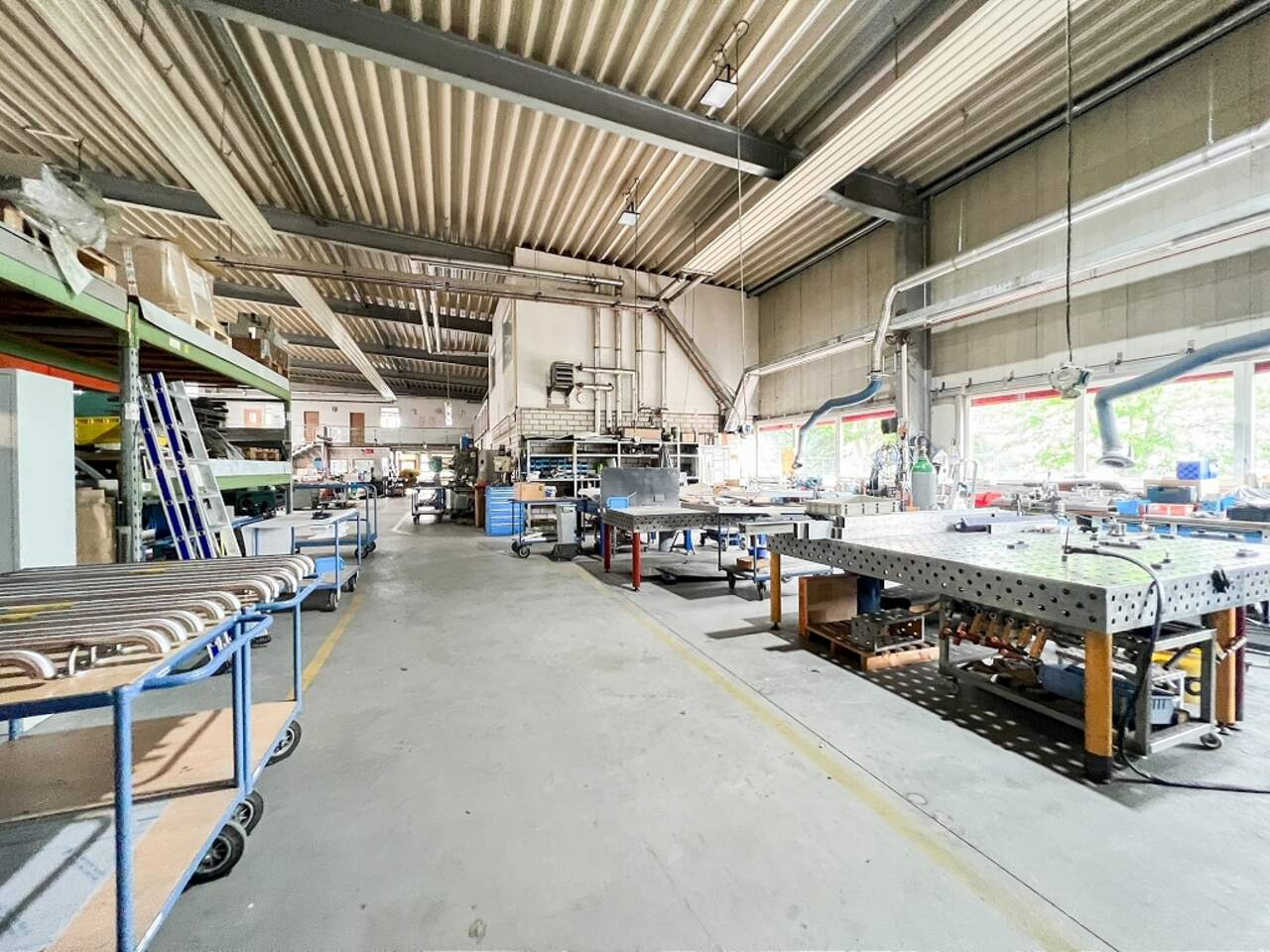 Zur Vermietung steht eine ca. 2.155 m² große Produktionshalle mit etwa 250 m² Lagerfläche sowie optional rund 210 m² Bürofläche. Die Immobilie befindet sich auf einem rund 12.800 m² umfassenden Gewerbeareal. Eine Teilung der Fläche ist ab ca. 1.000 m² möglich.