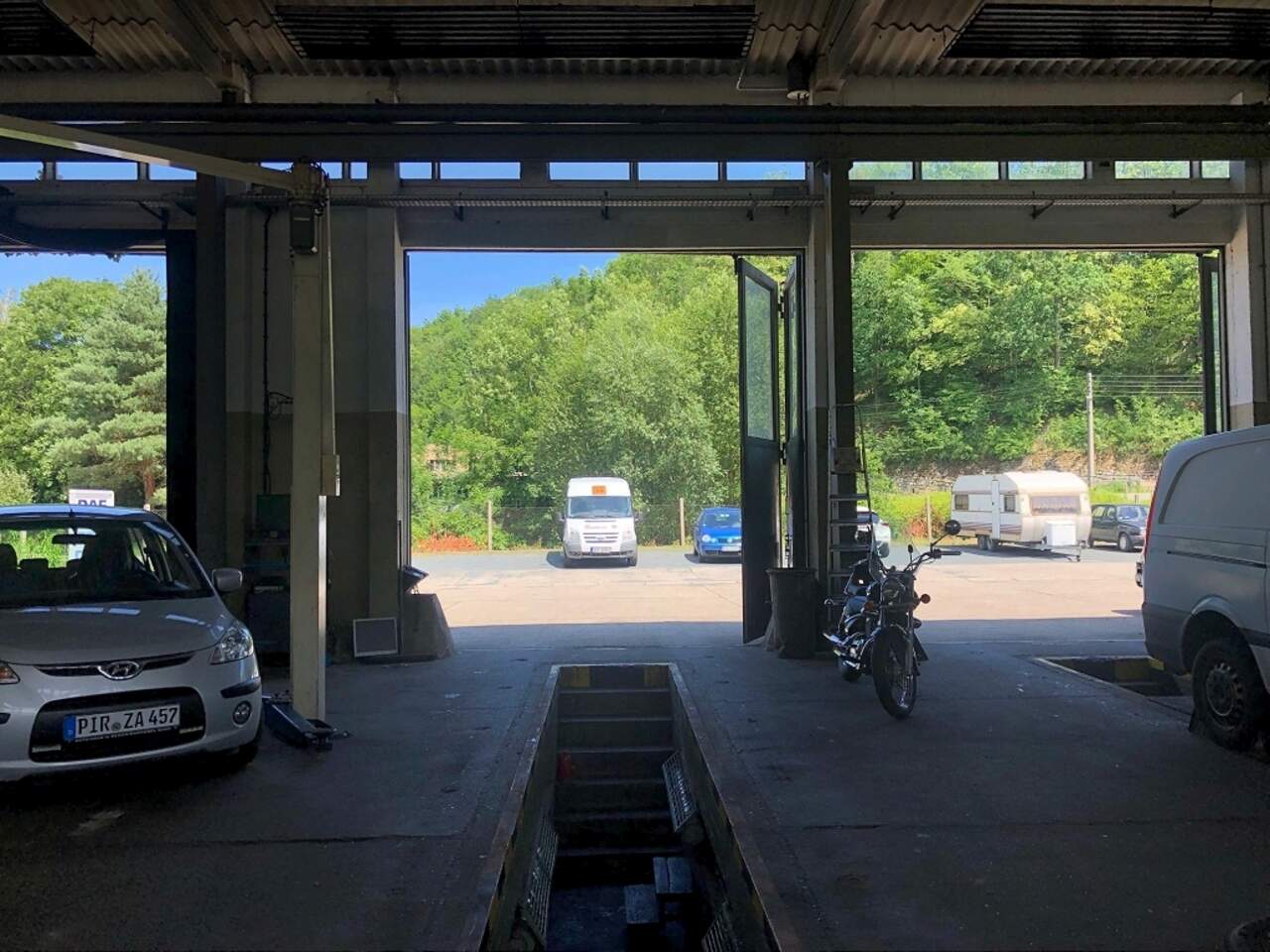 Die Halle ist ebenerdig befahr- und an der äußersten Hallenseite auch durchfahrbar. Auf Grund der Nutzung als KfZ-Werkstatt, sind im Boden mehrere Reparaturgruben eingelassen. Der Zugang in die Halle erfolgt über mehrere Falttore. Des Weiteren gibt es einen direkten Durchgang über der Büro- und Sozialtrakt, welcher sich am Kopf der Halle über zwei Etagen verteilt.