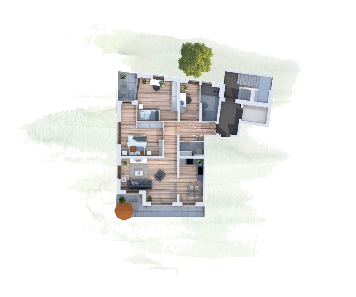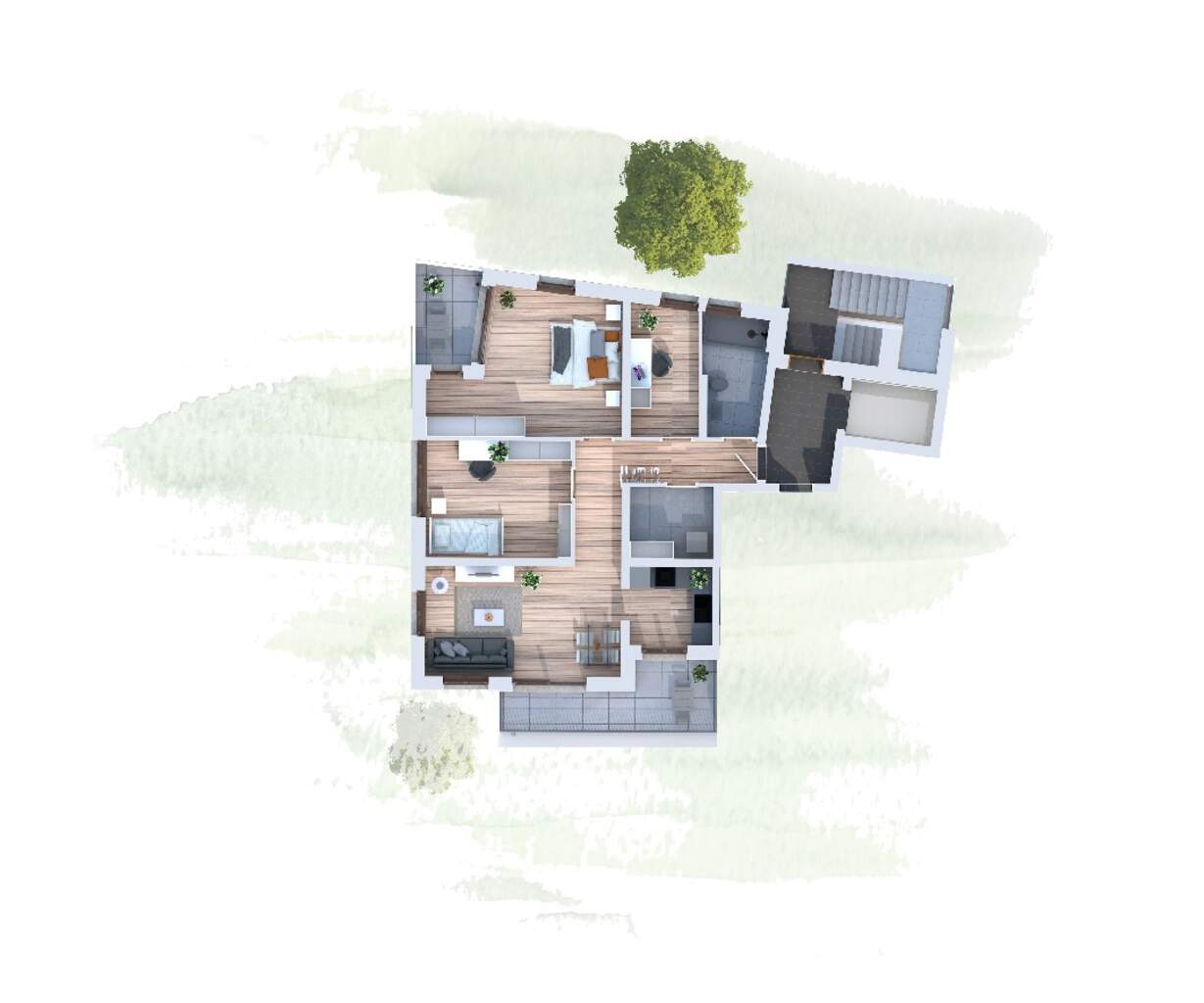 Alle Wohnungen sind vollständig barrierefrei gestaltet und über einen Aufzug bequem erreichbar. Von der hauseigenen Tiefgarage gelangt man stufenlos in die Wohnungen. Im Untergeschoss befinden sich zudem praktische Abstellräume sowie großzügige Gemeinschaftsbereiche für Fahrräder und Kinderwagen, darunter zwei stufenfrei befahrbare Fahrradkeller. Weitere überdachte Stellplätze befinden sich im Erdgeschossbereich auf der Gebäuderückseite sowie zusätzliche Stellplätze im Außenbereich. Im Erdgeschoss des Gebäudes ist eine kleine Gewerbeeinheit vorgesehen.