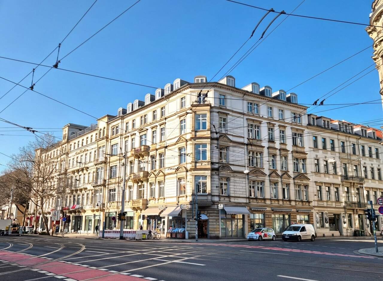 Die Immobilie befindet sich in Dresden Neustadt, direkt an einem frequentierten Kreuzungsbereich und fußläufig von Haltepunkten des ÖPNV.