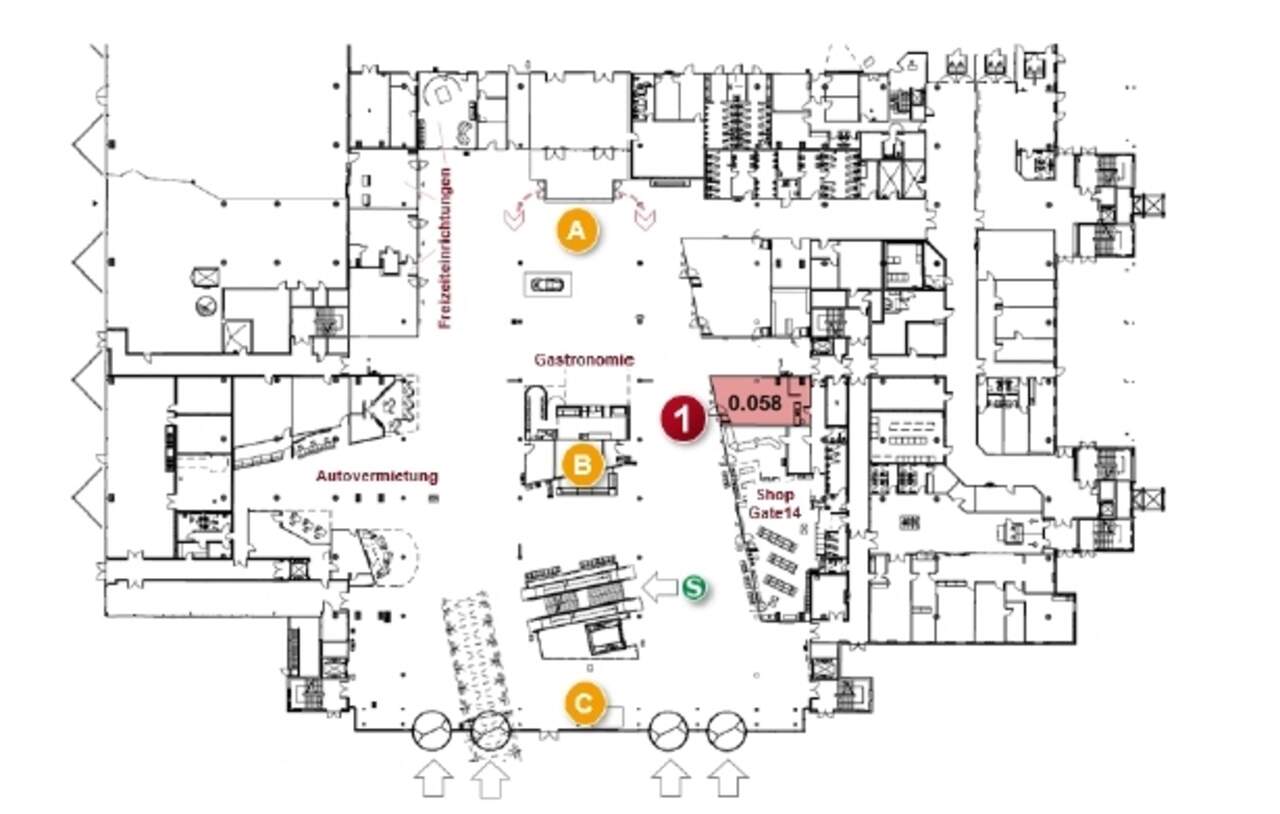 Zur Vermietung steht eine Bürofläche mit ca. 74 m², die sich im Flughafen Terminal befindet. Die Mietfläche befindet sich in gut sichtbarer und in zentraler Lage im öffentlichen Ankunftsbereich sowie auf der westlichen Hälfte der Abflugebene, neben den Check-In Bereich und entlang der Laufwege der Passagiere zu den Sicherheitskontrollen.