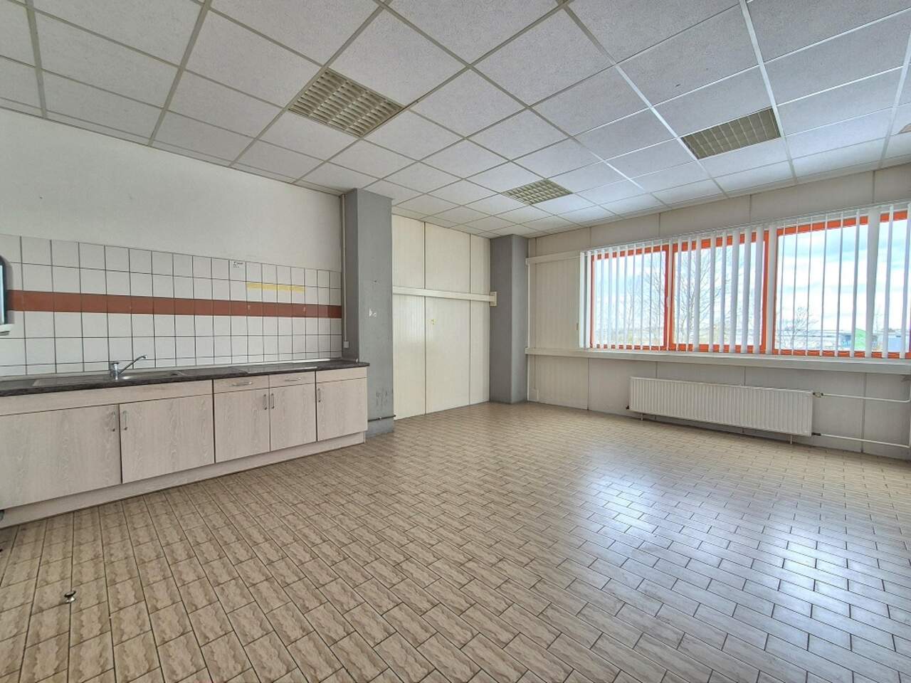 * Zwei Büros und Aufenthaltsraum an Nordseite, Metallfenster, Blendrahmentüren mit Dekorfolie, abgehängte Decken, Flachheizkörper und Klimaanlage