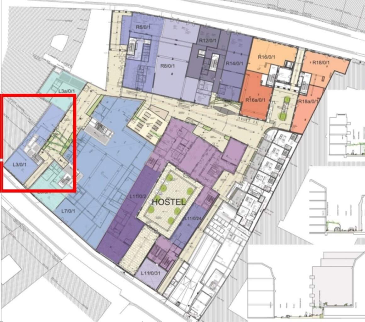 Im Innenbereich des Quartiers werden die Gebäude separat gegliedert. Quer zur Straßenbebauung stehende Häuser schaffen differenzierte Innenhöfe, die miteinander verbunden sind und individuell gestaltet werden. Mehrere Durchwegungen zwischen Rampischer Straße und Landhausstraße verbinden die Innenhöfe miteinander und vernetzen das Quartier mit dem Neumarkt. Die Begrünung der Höfe und Durchgänge trägt zu einem einladenden Ambiente bei.