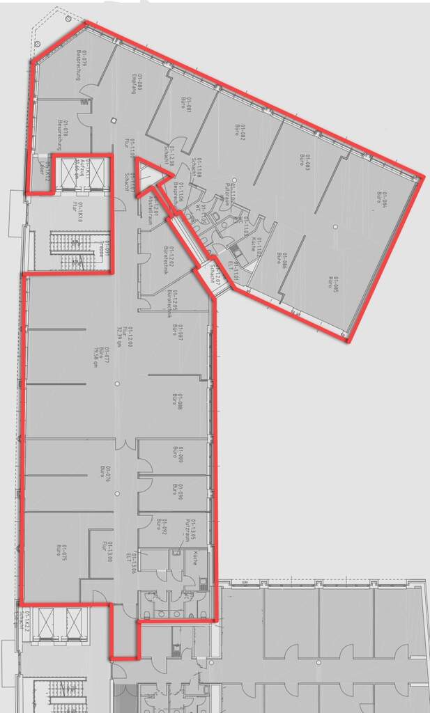 Zur Vermietung steht eine ca. 711 m² große Bürofläche, die sich im 1. Obergeschoss eines siebengeschossigen Büro- und Geschäftshauses (Baujahr 1998) befindet. Die Mietfläche steht ab dem 1.12.2025 zur Verfügung.