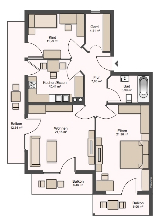 Das Highlight der Wohnung bilden die 3 großzügigen Süd- bzw. Westbalkone mit ca. 12 und 6 m².