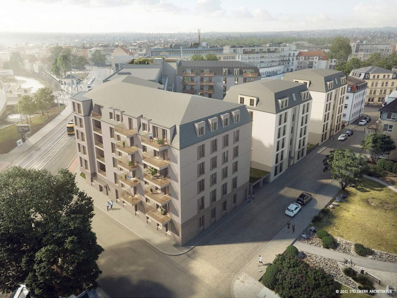 Die verschiedenen Gebäudeteile werden unterirdisch durch eine gemeinsame Tiefgarage verbunden sein. Oberirdisch wird ein begrünter und attraktiv gestalteter Innenhof für eine besondere Aufenthaltsqualität sorgen.