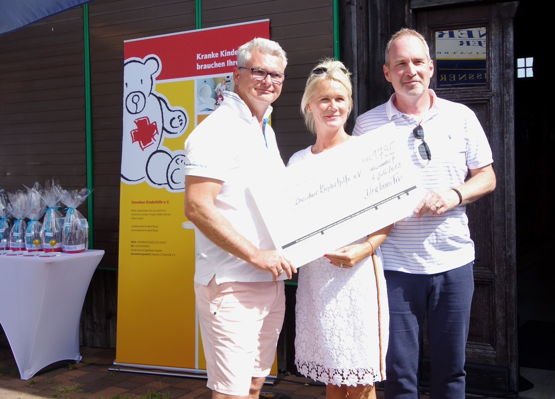 Letzten Samstag starteten bei bestem Golfwetter 60 Teilnehmer zum vorgabewirksamen 18-Loch-Tunier auf der Golfanlage Possendorf. DER IMMO TIP ist zum ersten Mal Gastgeber des Charity Golf Turniers, welches zugunsten der Deutschen Kinderhilfe e.V. ausgetragen wurde. „Soziales Engagement und sportliche Betätigung sind wichtig, verbinden und machen Spaß.“ so Geschäftsführer Uwe Schatz. Aus den Einnahmen der Startgelder sowie Spenden der Sportler und Gäste konnte ein Scheck über 1.795 Euro an den Vorstandsvorsitzenden Michael Doerwald von der Dresdner Kinderhilfe übergeben werden. Der Verein setzt sich für chronisch kranke Kinder und deren Familien ein. Im Verlauf des Nachmittags gingen weitere Spenden ein, so dass letztlich eine Spendensumme von 2.190 Euro zusammen kamen.