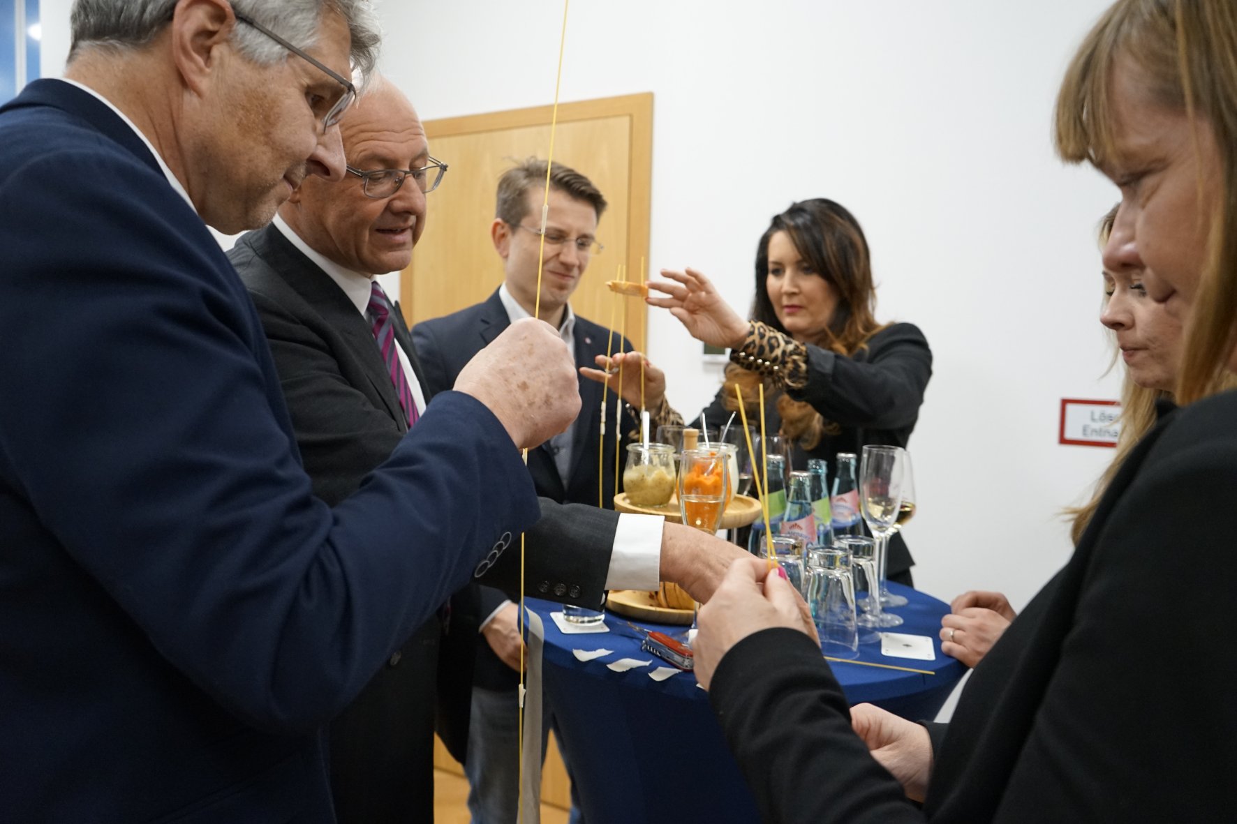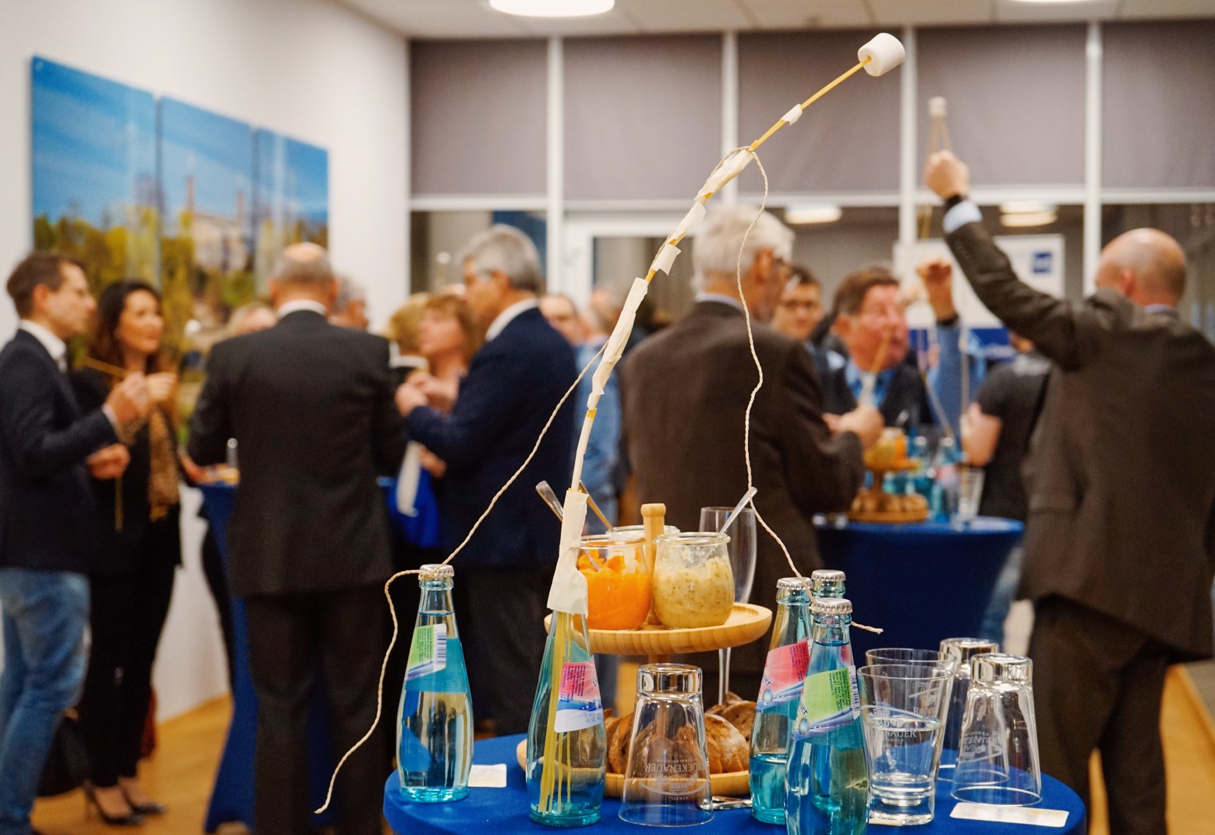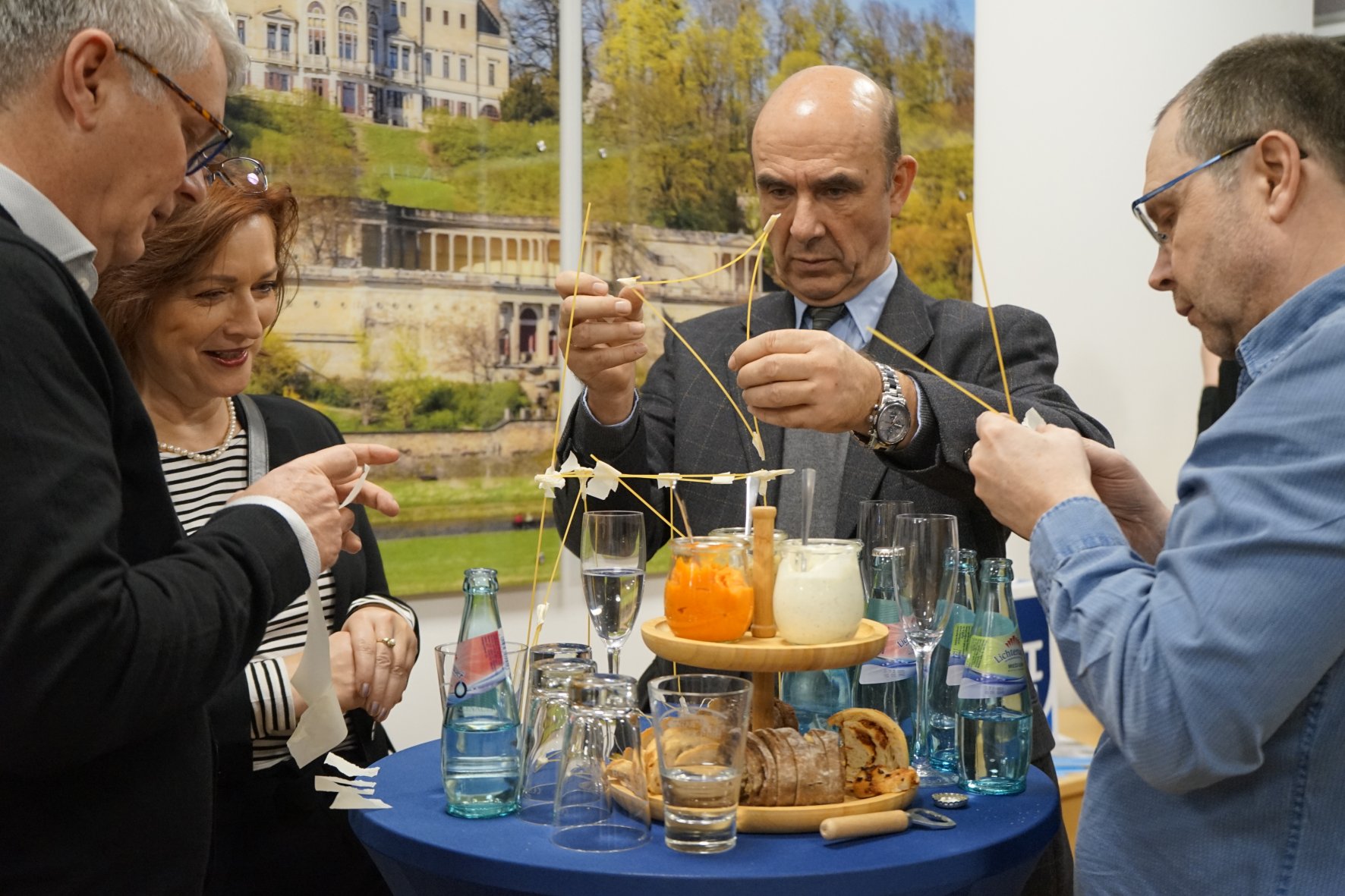 Begrüßt wurden die rund 50 IVD-Mitglieder und Gäste durch Uwe Schatz, Geschäftsführer von DER IMMO TIP und durch Julia Teuscher-Bergien von der Deutschen Kreditbank. Durch den Abend führte Martin Schatz, Geschäftsführer von DER IMMO TIP und stellte die Gäste zu Beginn vor eine spielerische Aufgabe. Aus Spaghetti, Klebeband und Strick sollte der höchste Turm gebaut werden, welcher an der Spitze ein Marshmallow tragen sollte. Gar nicht so einfach, wurde sehr schnell festgestellt. Der Ehrgeiz war jedoch geweckt und die Teams vollendeten mit mehr oder weniger standfesten Bauwerken diese Challenge.