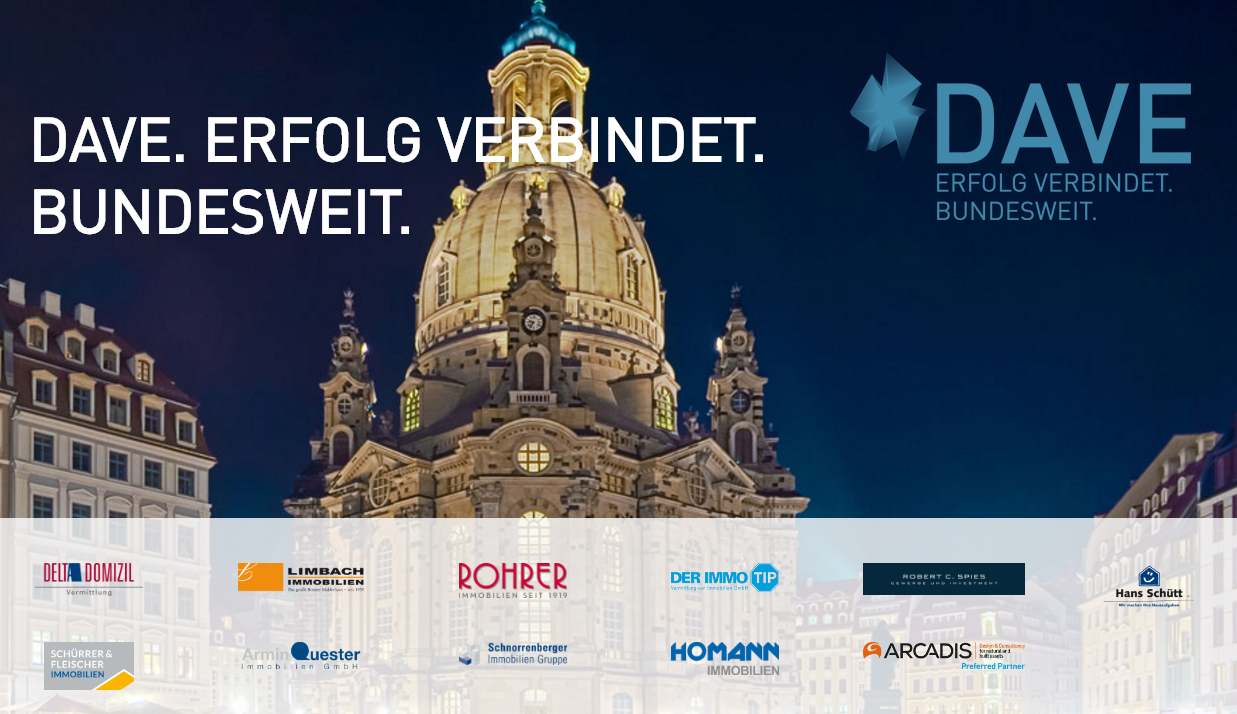 DER IMMO TIP ist seit 2010 DAVE-Partner des 2003 gegründeten Verbundes. Der Deutsche Anlage-Immobilien Verbund (DAVE) ist ein Zusammenschluss von 10 inhabergeführten Immobilienberatungsunternehmen an 25 Standorten in Deutschland. DAVE bietet somit bundesweite Präsenz verbunden mit hoher lokaler Kompetenz. Der Verbund vermittelt die Interessen von Unternehmen, Institutionen, Erbengemeinschaften und Privatpersonen sowohl als Käufer als auch als Verkäufer. DAVE-Kunden profitieren von der Vernetzung der inhabergeführten Immobilienberatungsunternehmen in den Bereichen An- und Verkauf, Marktanalysen, Objektbewertung, Bestandsverwaltung sowie Portfolio-Optimierung.