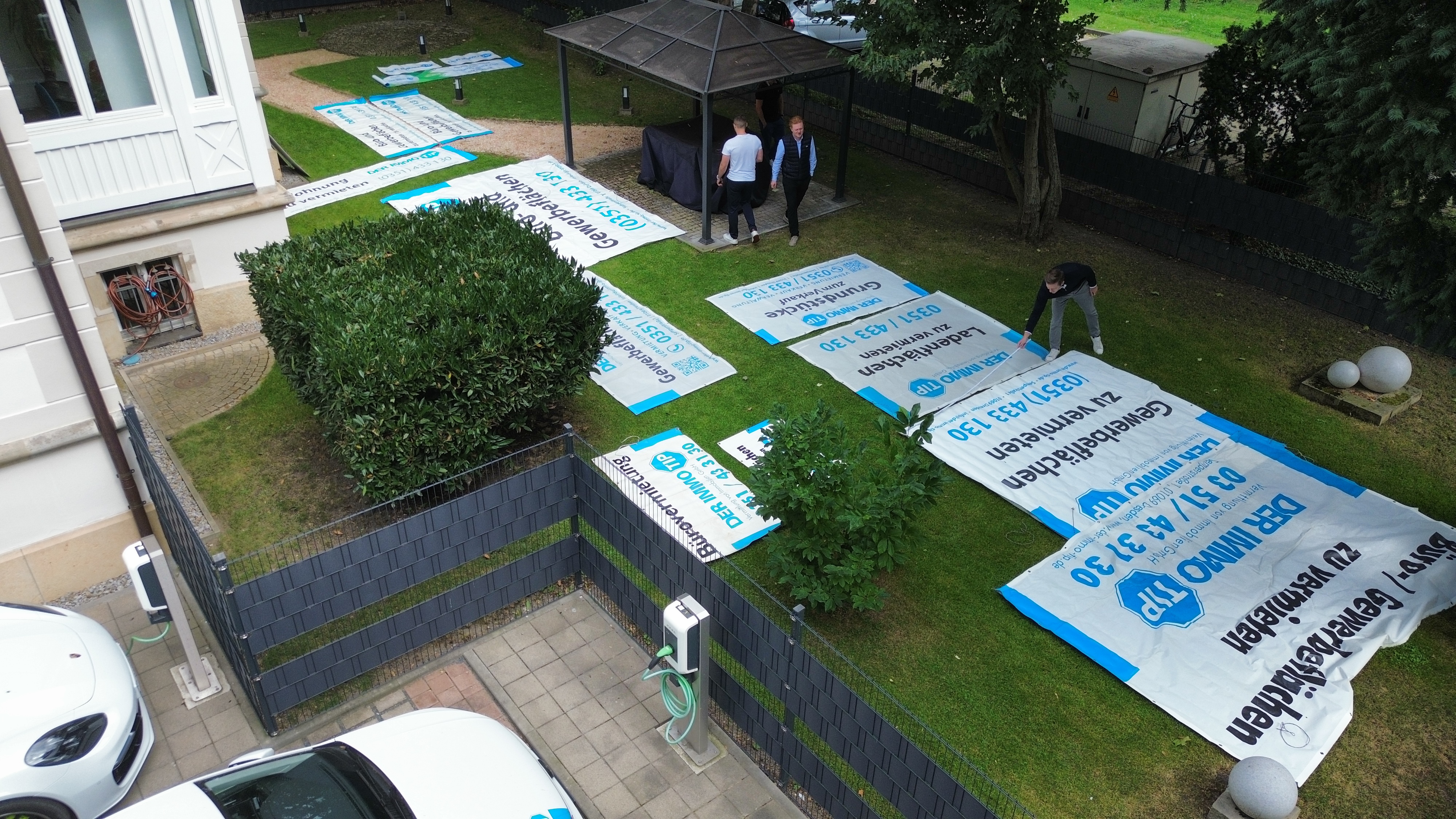 Wenn wir auf unsere Standard-Planen oder Tafeln aus dem Bestand zurückgreifen und diese an vorhandenen Montagepunkten (z. B. Zaun, Balkon oder Geländer) anbringen können, ist dies bereits in unserer Leistung enthalten – also mit der üblichen Provision abgedeckt.